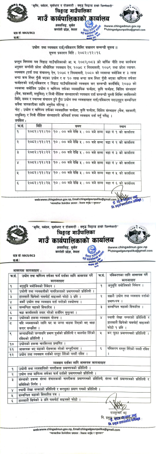 उद्योग तथा व्यवसाय दर्ता/नविकरण शिविर सख्ालन सम्बन्धी सूचना !! सूचना प्रकाशन मिति : २०८२।१२।१६
