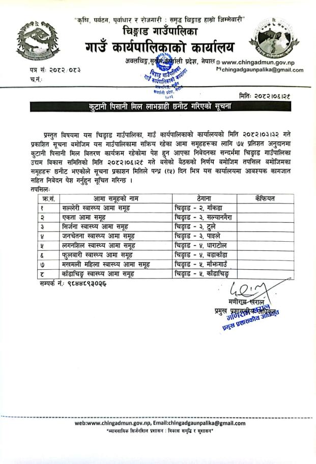 » कुटानी पिसानी मिल लाभग्राही छनोट गरिएको सूचना ।